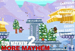 귀여운 캐릭터 2명이 화려한 그래픽을 배경삼아 치열한 전투를 벌여야 하는 2인용 총게임인 건메이헴 버전2입니다.오리지널 1편의 인기로 새롭게 나온 버전인데 1편 못지않게 재미 측면에서도 상당한 수준을 보여주고 있습니다.둘이서 하려면 custom game으로 들어가 player setup에서 추가를 해주시면 됩니다.