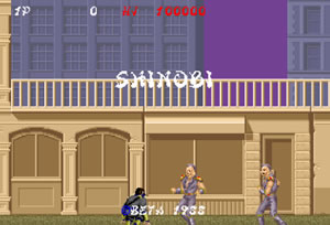 올블랙 스타일의 전형적인 닌자가 되어 수리검을 날리며 적을 해치우고 앞으로 전진하는 횡스크롤 타입의 액션 타이틀인 시노비입니다.움직임이 좀 딱딱해보이고 금새 끝날것 같이 쉬워 보이지만 은근 난이도가 있어 원코인으로 깨기가 상당히 어려울겁니다.수리검 날리는 재미가 꽤나 좋습니다.