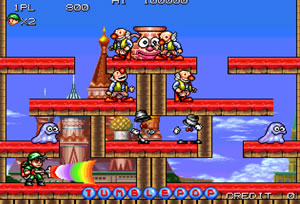 무지개빛 광선이 나가는 진공청소기를 들고 몬스터를 상대하는 아케이드형 타이틀인 텀블팝입니다.흡수한 몬스터를 그냥 발사키를 눌러 발사할 수도 있고 일정 시간 기다렸다가 자동으로 나가게 할 수도 있습니다.클리어 조건은 스테이지에 등장한 모든 몬스터를 제거해주시면 됩니다.