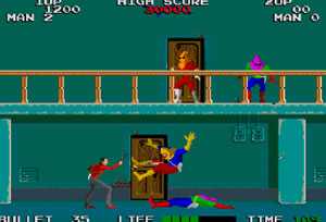 삼각 복면을 쓴 악당의 기지에 잠입한 스파이의 맹활약을 다룬 타이틀로 그래픽은 단순하지만 빠른 전개로 보상받을만한 타이틀인 롤링썬더입니다.총알 갯수에 제한이 있는데 전부 쏘게 되면 기본형 권총으로 바뀌고 아쉽지만 살짝 성능이 떨어집니다.초반엔 왼쪽 하단의 총알 갯수를 확인하면서 너무 총알을 남발하지 않도록 주의해 주세요.