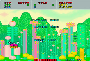 파스텔 톤의 동화속 배경을 바탕으로 랜덤으로 마구잡이로 출현하는 다양한 적들을 제거하면서 앞으로 진행하는 횡스크롤형 타이틀인 판타지 존입니다.좌우 움직임에 따라 주무기의 발사방향도 바뀌게 되며 폭탄의 경우는 제한은 없지만 발사하고 나서 다음 발사할때까지의 쿨타임이 존재합니다.적들의 움직임이 워낙 복잡해서 부지런히 피해다니면서 상대를 하셔야 할겁니다.