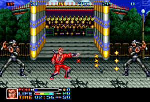 3개의 표창을 던지는 닌자 캐릭터가 등장하는 타이틀로 강렬한 배경과 교묘한 수법이 적들이 특징인 닌자 컴뱃입니다.전투를 벌이다가 상대에게서 얻은 무기는 바로 사용이 가능하며 계속해서 떨어지는 체력아이템을 먹어 감소한 체력도 채워줄수 있습니다.차지 기능이 있는데 공격키를 계속 누르고 있다가 전부 채웠을때 버튼에서 손을 떼면 필살기가 펼쳐지게 됩니다.