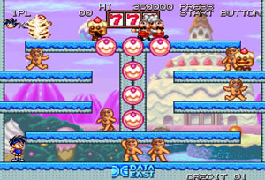 살이 찌는걸 막기위해 케익이나 빵, 사탕 등의 공격을 피하면서 몽땅 날려버리면 다음 스테이지로 이동하게 되는 다이어트 고고입니다.버블버블과 비슷하게 뭔가를 쏘아 적을 가두고 부딪쳐서 없애면 되고 밑으로 내려갈때 아랫쪽 이동키를 눌러주고 점프키를 눌러주면 통과를 할수 있습니다.보스전의 경우 적을 가둔 상태로 부딪쳐 적이 보스와 부딪치게 하면 됩니다.
