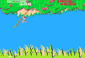 납치된 제인을 구하기 위해 정글의 온갖 장애물을 돌파해서 시간내에 목표 지점까지 도달해야 하는 타이틀인 타잔게임입니다.시작되면 나무 줄기부터 타야 하는데 타이밍에 맞게 다음 줄로 점프를 해야 하며 실수를 하면 밑으로 떨어져 다시 타야 합니다.윗쪽을 잡아도 크게 문제 없으며 오로지 타이밍만 생각하시면 됩니다.두번째 장애물인 악어의 경우 정면으로 가면 바로 아웃이니 밑에서 제거를 해주셔야 합니다.
