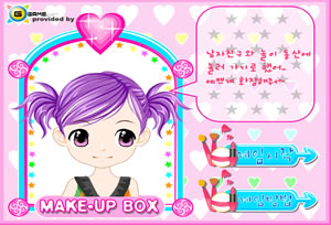 눈썹모양, 속눈썹 꾸미기, 볼터치 색깔 , 립스팁 색깔, 립스틱 포인트 등등 데이트를 나가기 위해 예쁘게 화장을 하는 과정을 체험해 보는 메이크업 박스 게임입니다.오른쪽에서 도구를 선택하면 하단에 모양이나 색깔을 선택하는 부분이 나오는데 도구를 클릭해 선택을 한후 얼굴에 터치를 해주시면 됩니다.만약 마음에 안들 경우에는 왼쪽에 있는 지우기 도구를 이용해 지우시면 됩니다.