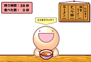 밥도 김치도 아니고 오로지 라면을 제한 시간내에 얼마나 많이 먹을수 있는지 마우스 속도로 결정짓게 되는 라면 빨리 먹기게임입니다.메뉴판에서 라면을 선택하고 그때부터 식사를 시작하면 되고 한그릇을 비우면 메뉴판을 다시 클릭해 또 식사를 하시면 됩니다.클릭을 하면 점점 라면이 없어지는데 몇번을 클릭해야 없어지는지 확인을 하고 횟수를 세면서 플레이하시면 좋은 성적을 거두실수 있을겁니다. 조작법 마우스 = 메뉴 선택, 식사