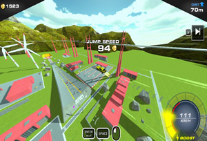 매우 높고 긴 활강 미끄럼을 빠른 속도로 타고 내려와 더 멀리 날아가면서 목표지점까지 도착해야 하는 자동차 점프 게임입니다.착지를 하고 난후에 성적이 나오고 성적에 따라 상금을 받게 되며 상금으로 부품 업그레이드를 해주시면 됩니다.업글은 엔진과 부스트, 보너스 부분이 있는데 한쪽만 계속 해줄수도 있고 골고루 해줄수도 있으며 상황에 따라 적절히 해주시면 됩니다.