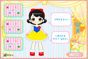 예쁘게, 귀엽게, 깜찍하게 중에 한가지의 헤어스타일을 골라 동화속 공주를 예쁘게 꾸며주는 예전 야후에서 플레이할수 있었던 백설공주 미용실게임입니다.헤어스타일을 선택후에 가위로 원하는 모양으로 커트를 해주고 맘에 드는 색깔로 염색을 해준 후에 매직이나 고데기를 이용해 마무리를 해주시면 됩니다.